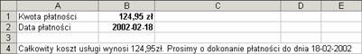 Rysunek 5.76. Formuła umieszczona w komórce A4 ="Całkowity koszt usługi wynosi "&B1&"zł. Prosimy o dokonanie płatności do dnia "&TEKST(B2;"dd-mm-rrrr")wyświetla tekst używając zawartości dwóch komórek, operatora konkatenacji oraz dwóch funkcji tekstowych.
