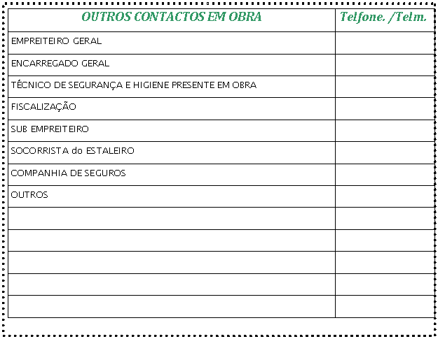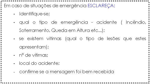 NOTA: Para facilitar todos os contactos necessários a estabelecer sempre que ocorram situações como as descritas, foi organizado um quadro contendo o numero de contactos úteis e de Emergência que poderá ser consultado nas PÁGINAS 3 e 4 deste Plano de Segurança e Saúde.