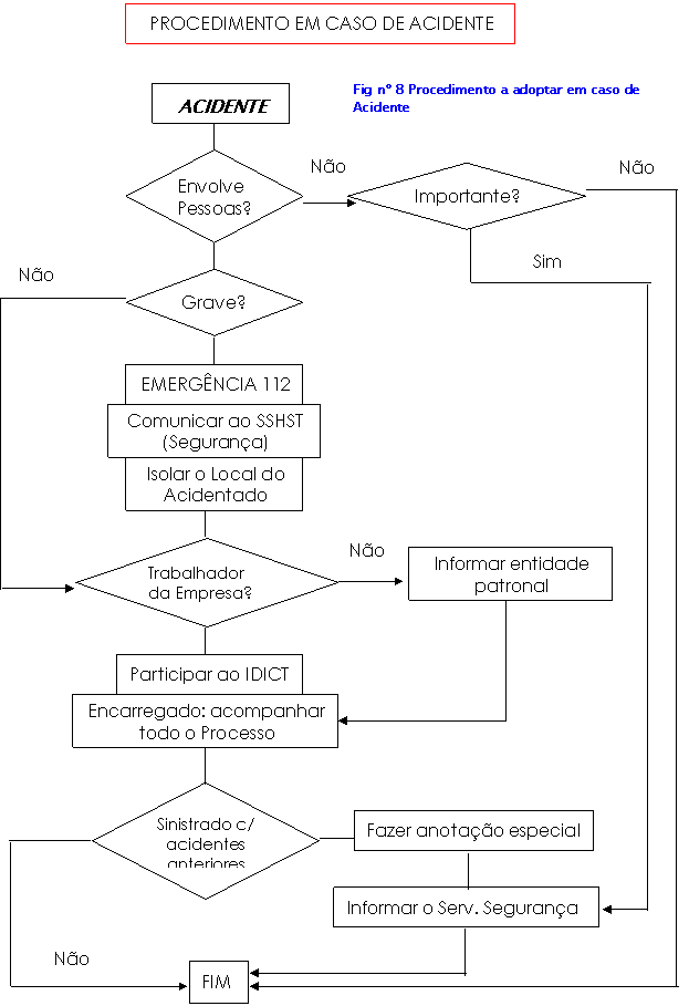O Plano de Emergência consiste na definiçao de quais os procedimentos a adoptar em caso de acidente, uma das formas é como a que se apresenta no esquema da PÁGINA49 Devem estar previstas medidas eficazes para primeiros socorros e para a evacuaçao de sinistrados ou mesmo de todos os trabalhadores em caso de catástrofe. É um auxilio essencial o plano de sinalizaçao previsto.