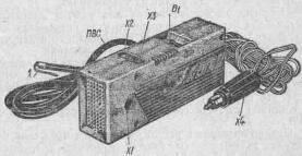 Пружинные зажимы "крокодил" (Х5, Х6) имеют гравировку полярности и заключены в разноцветные резиновые чехлы. Корпус переходника-разрядника Рр1 пластмассовый, расстояние между электродами 3 мм, вилка Х2 и гнездо XI