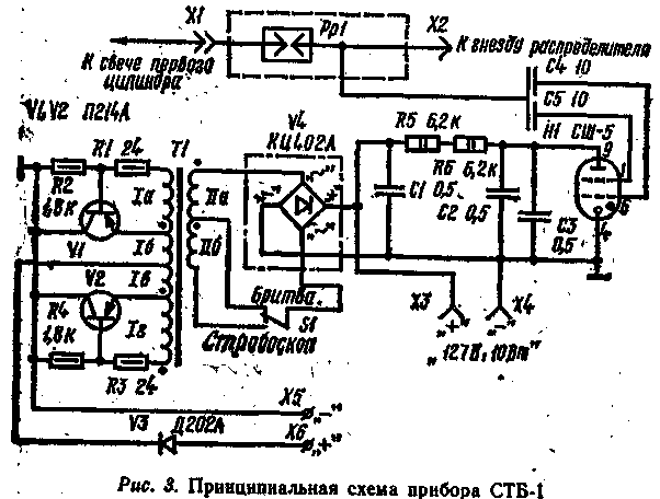 Нашей промышленностью выпускаются стробоскопи 24424x238y 095;еские приборы: автомобильный стробоскоп СТБ-1 (рис. 1) и прибор "Авто-искра" (рис. 2), предназначенные для проверки и регулировки начальной установки угла опережения зажигания на автомобилях.