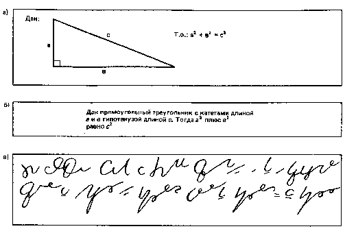 конспекте он видит не слова, а уже готовые образы; -во-вторых, ему легче запоминать, так как этот материал уже один раз был осмыслен на уроке в процессе обдумывания, как лучше записать эту фразу. Кроме того, зрительные образы (типа рисунка треугольника) запоминаются лучше, чем описательный текст Школьник Б скорее всего читает свой конспект как впервые увиденный текст на лекции все прошло мимо сознания. Кстати, школьнику В, который благодаря умению стенографировать не очень утомлялся на лекции, сейчас приходится трудновато, так как расшифровка стенографической записи требует дополнительных умственных усилий (в стенограмме хуже распознаются отдельные буквы).