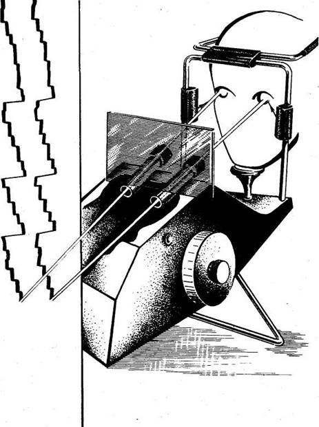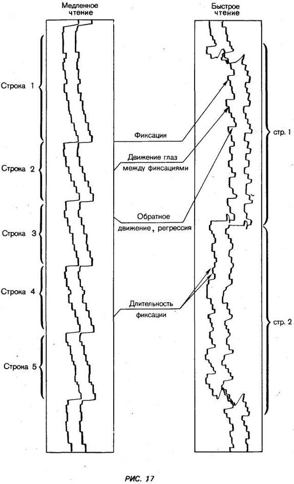 Для выявления рациональной техники движения глаз посмотрим, как двига 818e414i 02;тся глаза человека, читающего быстро и читающего медленно. Специальная аппаратура (рис. 16) позволяет детально исследовать движения глаз во время чтения.