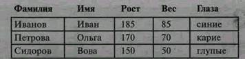 Данные об объектах, людях или вещах, в этих таблицах записываются в виде строк. В приведенном примере сведения о росте, весе и цвете глаз Петровой Оли записаны во второй строке.
