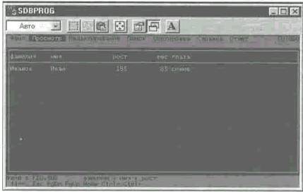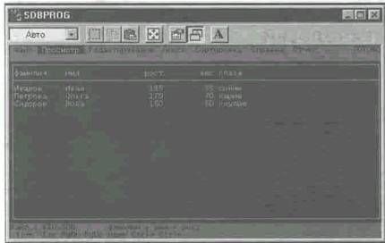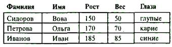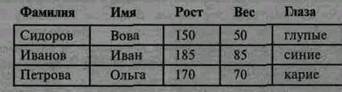 В рассматриваемом примере таблица имеет пять столбцов с именами фамилия, имя, рост, вес и глаза. В каждом из столбцов могут записываться данные опред 19119k1013t 077;ленного типа - числового или символьного. Так, в столбцах вес и рост записываются числовые данные, а в столбцах фамилия, имя и глаза записывается символьная информация.
