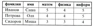 . Пусть имеются трое студентов: Иванов, Петрова и Сидоров со следующими оценками по физике, математике и информатике: