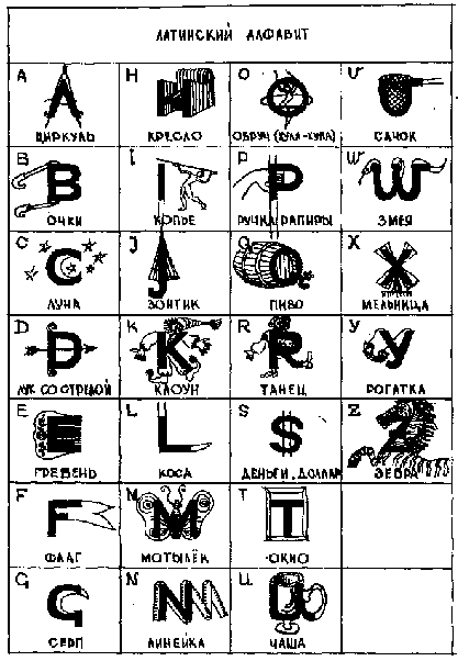 С помощью этого способа вы можете очень просто запомнить список из любых 26 слов. Этот способ можно использовать для запоминания списка железнодорожных станций. Речь здесь идет о словах без смысла, необходимо поэтому сначала переделать каждое название города в конкретное слово, которое вам напомнит это название. Горький, Серпухов, Клин, Ростов будут представлены как горчица, серп, клин, росток дерева и т.д. Слово "горчица" вы ассоциируете с циркулем, затем серп- с очками и т.д.