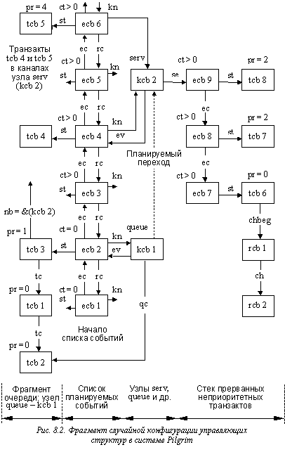 Кроме того, для специальных применений (при создании новых операционных систем ОС, систем управления базами данных СУБД, систем имитационного моделирования СИМ) списки являются основой соответствующих управляющих программ. На рис. 8.2. приведен без комментариев внутренний аппарат современной системы имитационного моделирования Pilgrim-5, применяемой для компьютерного моделирования экономических процессов