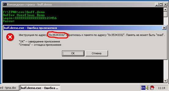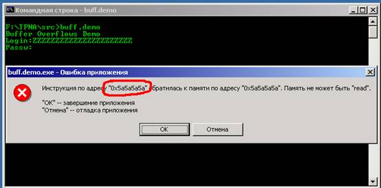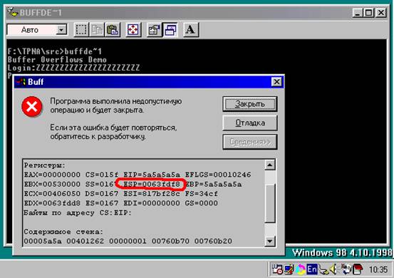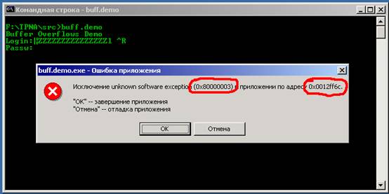 . Он получен после возникновения исключения в результате переполнения буфера программы buff demo exe