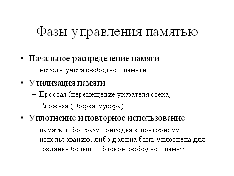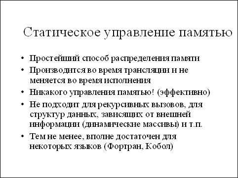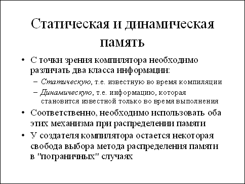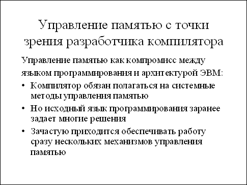 Любой компилятор является всего лишь одним из многочисленных приложений, работающих под управлением данной операционной системы, и потому при обращении к системным ресурсам компилятор вынужд 11311q165l ;ен полагаться на предоставляемые стандартные функции и примитивы. Таким образом, управление памятью с точки зрения компилятора существенно ограничено возможностями целевой архитектуры и операционной системы. С другой стороны, большое количество решений по управлению памятью делается уже на этапе создания языка программирования (подробнее об этом ниже).