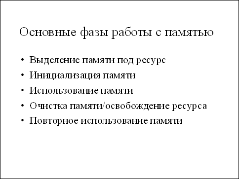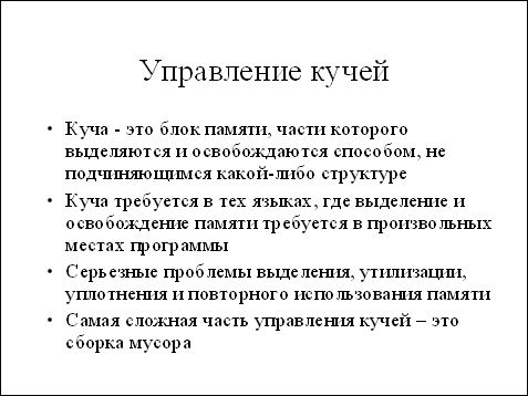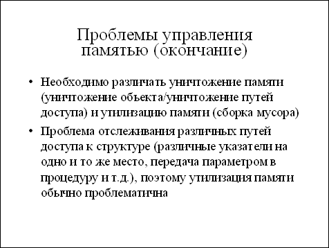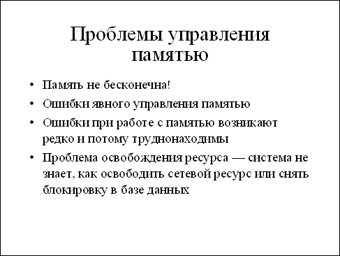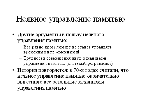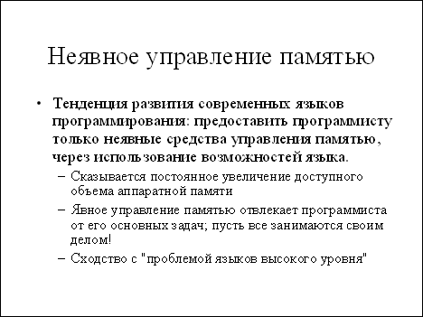 Кроме того, неявное управление памятью освобождает программиста от большого объема рутинной работы по отслеживанию занимаемой и возвращаемой памяти, так как все проблемы этого процесса "скрываются" от него компилятором. Это значит, что с программиста снимается ответственность за еще один системный вопрос, не относящийся напрямую к его основным задачам и он сможет больше времени посвящать собственно прикладным вопросам.