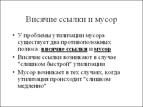 Можно сказать, что висячие ссылки возникают в тех случаях, когда память утилизируется "слишком быстро" (т.е. раньше, чем память действительно перестает использоваться), а мусор - когда память утилизируется "слишком медленно" (т.е. позже, чем она могла бы быть возвращена). Висячие ссылки более опасны, так как могут приводить к некорректной работе программы, в то время как появление мусора вполне допустимо. Борьбу с мусором обычно возлагают на специальный процесс, называемый сборкой мусора (garbage collection