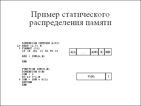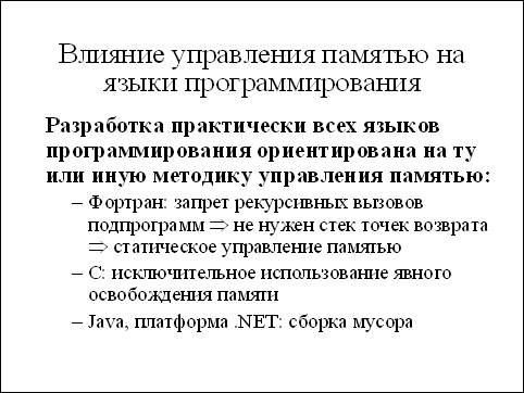 Любопытно, что именно по этой причине "выжил" один из самых ранних языков программирования Фортран. Дело в том, что для Фортрана можно в среднем скомпилировать более эффективную программу, чем для языков с более сложной системой управления памятью, а именно скорость выполнения была главным параметром в основных областях применения этого языка (математические и прочие научные расчеты). Со временем эффективность работы программы стала менее важной, чем удобство программирования, но к тому моменту уже был накоплен огромный багаж работающих программ, и потому Фортран по-прежнему скорее жив, чем мертв.