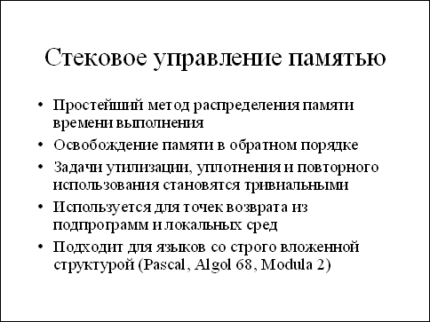 Так как статическое распределение памяти чрезмерно ограничивает программиста, проектировщикам языков программирвоания со временем пришлось перейти к более сложным средствам управления памятью, работающим во время выполнения программы. Самым простым из таких методов является стековое управление памятью. Его идея заключается в том, что при входе в блок или процедуру на вершине специального стека выделяется память, необходимая для размещения переменных, объявленных внутри этого блока. При выходе же из блока память снимается не "вразнобой", а всегда только с вершины стека. Понятно, что задачи утилизации и повторного использования становятся тривиальными, а проблемы уплотнения просто не существует.