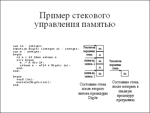 Стековое управление памятью особенно выгодно для языков со строгой вложенной структурой входов в процедуры и выходов из них. Дополнительно необходимо потребовать, чтобы структуры данных имели фиксированный размер, могли создаваться программистом только при входе в процедуру и обязательно уничтожались при выходе. Тогда всю информацию, необходимую для работы данной процедуры или подпрограммы, можно собрать в так называемую активационную запись, полностью определяющую данный экземпляр процедуры. В таком случае стекового управления памятью достаточно для всех элементов данных, используемых в программе.