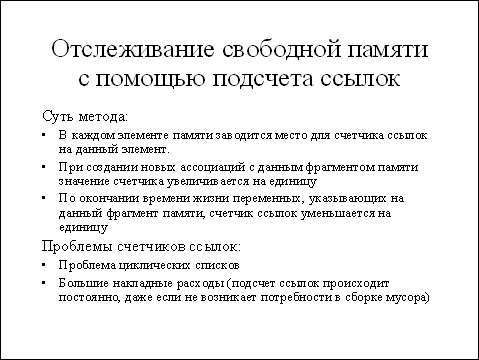 Самый простой способ отслеживания свободной памяти заключается в приписывании каждому объекту в памяти специального счетчика ссылок, показывающего количество "живых" переменных, использующих данный объект. При первичном выделении памяти в программе счетчику присваивается значение, равное единице; при создании новых указателей на данный фрагмент памяти, значение счетчика увеличивается на единицу. Если какая-то из переменных, указывающих на данный фрагмент памяти, перестает существовать, значение счетчика ссылок уменьшается на единицу. При достижении счетчиком нуля фрагмент памяти считается более не используемым и может быть утилизирован. Отметим также, что в эту схему легко вписывается и явное управление памятью: оператор free