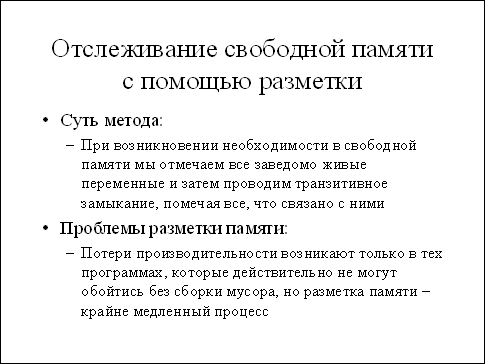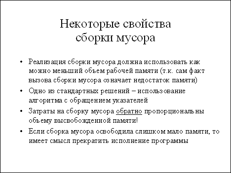 Другая интересная особенность сборки мусора заключается в том, что затраты на ее исполнение обратно пропорциональны объему высвобожденной в результате памяти. Это связано с тем, что основные затраты во время сборки мусора приходятся именно на фазу маркировки и, следовательно, чем больше активных элементов в куче, тем процесс дороже. В предельных случаях - когда в результате сборки мусора освобождается совсем мало памяти - программа практически прекращает полезную деятельность, так как для продолжения работы ей снова и снова приходится прибегать к сборке мусора, но скорее всего, никакого улучшени при этом не происходит (в таких случаях говорят, что программа "жужжит"). По этой причине многие алгоритмы сборки мусора ставят для себя специальную нижнюю границу: если алгоритму не удалось освободить больше некоторого заранее заданного объема памяти, то программа тут же завершается.