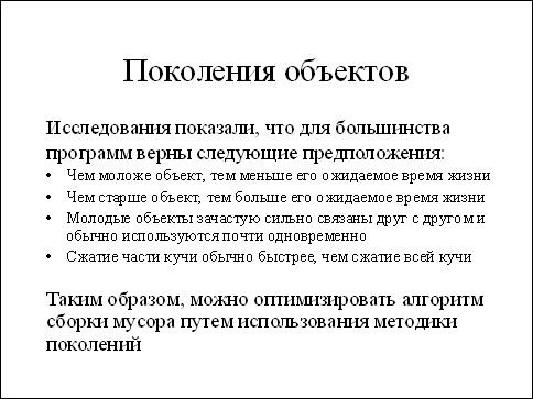 Упомянем еще одну распространенную оптимизацию, применяемую при сборке мусора: учет поколений объектов. Практические исследования показали, что в современных языках программирования активность объекта зависит от его возраста, причем нетривиальным образом: чем старше объект, тем больше его ожидаемое время жизни. Подавляющее большинство элементов программы используются сугубо локально, чаще всего все время жизни переменной в программе (от описания до последнего использования) умещается в пределы одного блока, процедуры или метода. Кроме того, типичный объект связан, в основном, со своими "сверстниками" и чаще всего умирает вместе с ними. Исходя из этого, логично предположить, что сборка мусора будет наиболее эффективной при обработке недавно созданных объектов. Действительно, большинство объектов утилизируются при первом же вызове сборки мусора.