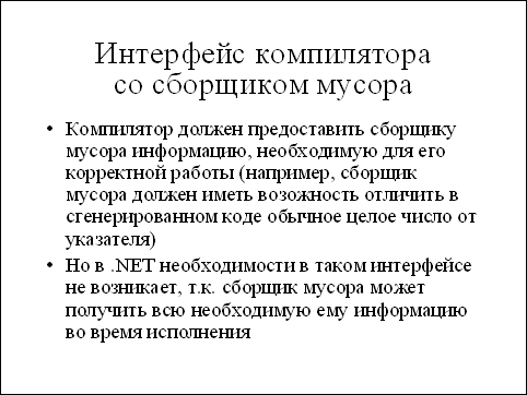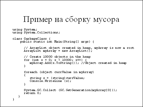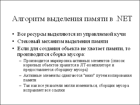 NET являются неявное управления памятью, стековый механизм выделения памяти и сборка мусора, использующая поколения и механизм "разметки-и-уплотнения" (mark and compact NET C fixed