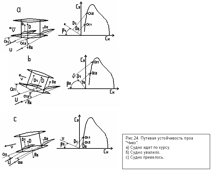 Пусть ял стоит носом к ветру; тогда он дрейфует назад, и на него действуют только две силы лобового сопротивления, аэродинамического - в надводной части и гидродинамического - в подводной. Они равны по величине, направлены навстречу друг другу и лежат на одной прямой. Разворачивающего момента этой пары сил нет, но данное положение может оказаться неустойчивым. В зависимости от конкретной конфигурации надводной и подводной частей корпуса яла точки приложения данных сил могут располагаться по разному; существенно, какая из них находится впереди, а какая сзади. При небольшом развороте яла от первоначальног 15415x2322p ;о положения возникает момент этой пары сил либо возвращающий ял в исходное положение, либо ставящий его боком к ветру.