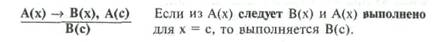В исчислении предикатов этот закон сохраняет свою силу. Однако в предикатной форме закон логического вывода превращается в конструктивную процедуру вывода новых сведений из имеющихся конкретных фактов и правил вывода.