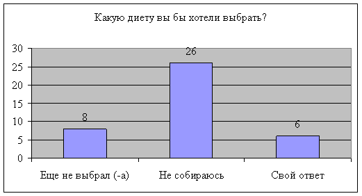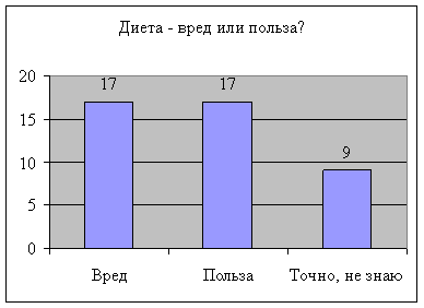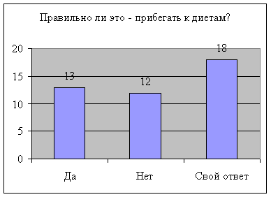 Проделав исследовательскую работу, мы выполнили задачи поставленные перед нами. Изучили историю диет, рассмотрели самые 3 популярных диеты и сделали вывод , что в большинстве случаев люди выбирают диеты отталкиваясь от мнения , что «раз все значит и я» . Забывая о том что только индивидуально подобранная диета способна привести к желаемому. Мы поняли, что каждый человек это неповторимая единица земного шара и к каждому нужен свой подход. Однако, исходя из анкетирования, мы поняли: большинство поверхностно относится к выбору диет и в связи с этим результата никакого. Для того чтобы лучше разобраться с диетами мы провели эксперимент с человеком и впоследствии взяли у него интервью.