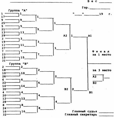 3. Места остальных бойцов, выбывших в группах определяются в соответствии с тем, в каком круге они закончили соревнование. Выбывшие в одном круге делят между собой соответствующие места.