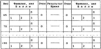 - либо по наименьшей сумме штрафных очков, начисляемых во всех весовых категориях каждому зачетному участнику с учетом занятого им места, по принципу: 1-е место - 1 очко, 2-е место - 2 очка и т.д. В последнем варианте считается, что команда должна обязательно выставить зачетное количество участников. За каждого не выставленного участника команде начисляется дополнительное количество штрафных очков, равное числу участников в той категории, в которой не выставлен участник (или в самой многочисленной весовой категории), плюс одно штрафное очко.