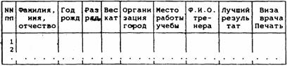 2. Заявка организации на участие ее членов в соревнованиях оформляется по установленной форме (см. прил. 5), с обязательным наличием заверенных печатями подписей руководителя организации, направляющей команду на соревнования, тренера и врача, удостоверяющих соответствующую подготовку участников. Подпись врача: «Допущен. Врач: (подпись)», печать - ставиться на каждого допущенного участника.