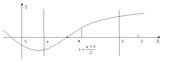 Если знаки f (x) и f (b не совпадают, то это означает, что f (x) пересекает ось x на правом полуотрезке [x, b a, x a в среднюю точку x (заменить значение приближения a на значение x).
