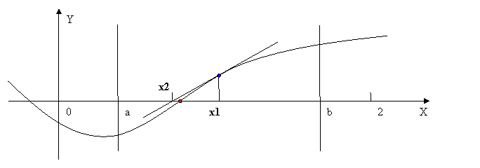 Пусть имеется начальное приближение к корню, которое обозначим x1. Например, можно взять середину отрезка [a b