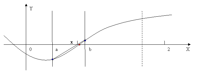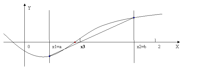 За начальные значения x1 и x2 берутся соответственно a b. Третья точка находится как точка пересечения отрезка, проведенного между точками (x1, f(x1)) и (x2, f (x2)) по формуле: