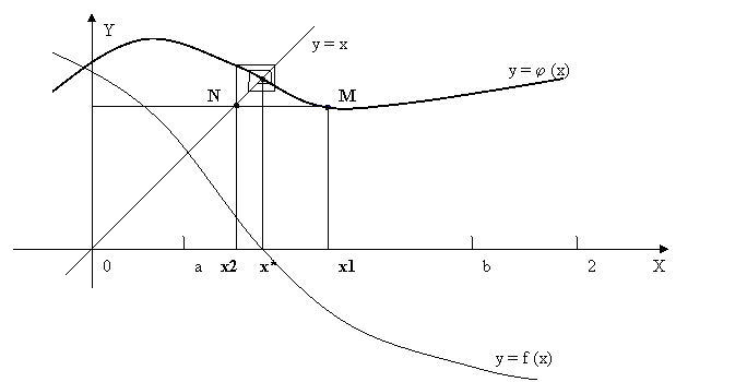 Рисунок иллюстрирует правило (8) для вычисления следующего приближения по методу простых итераций. На этом рисунке точка М имеет координаты (x1, j (x1)), точка N - координаты (x2, j ( x1