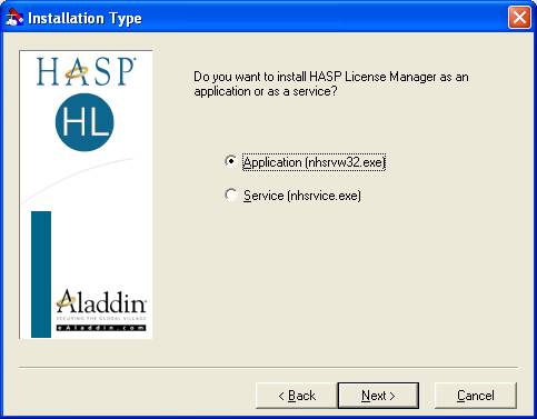 В случае установки HASP License Manager на компьютере, работающем под управлением операционных систем Windows NT/2000/XP/Server 2003, будет предложено два варианта установки HASP License Manager - как приложение (Application) или как служба (Service). В случае установки HASP License Manager на компьютере, работающем под управлением операционных систем Windows 98/Me, этот диалог будет пропущен, так как в этих операционных системах может быть установлено только приложение.:
