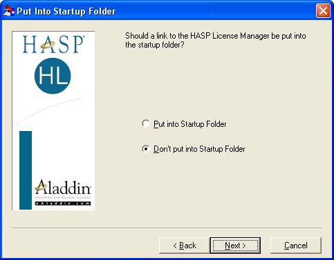 В случае установки HASP License Manager в качестве приложения Windows будет предложено поместить ярлык HASP License Manager в каталог "Автозагрузка" (Startup):