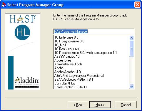 На следующем этапе установки предлагается выбрать группу, в которой будут размещены ярлыки запуска HASP License Manager и файла помощи:
