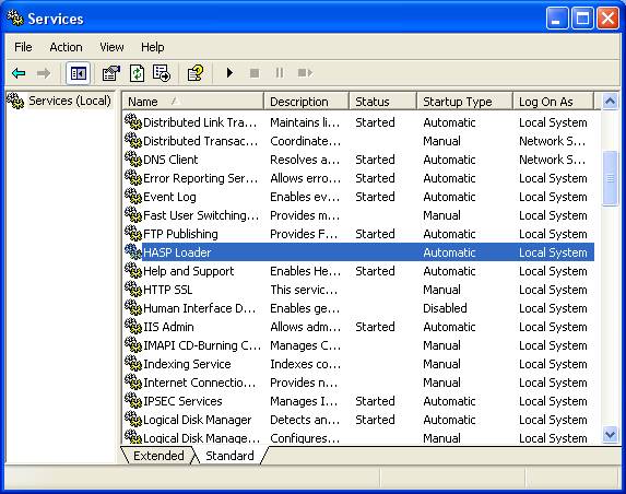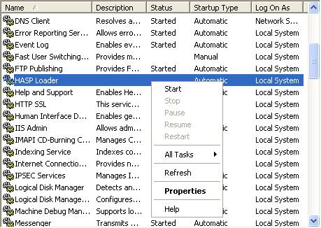 В появившемся списке служб следует найти службу HASP Loader