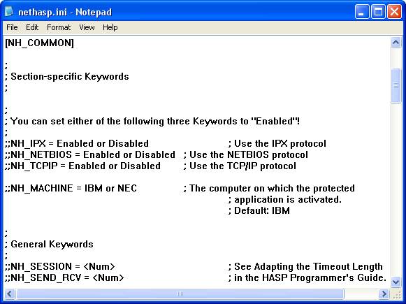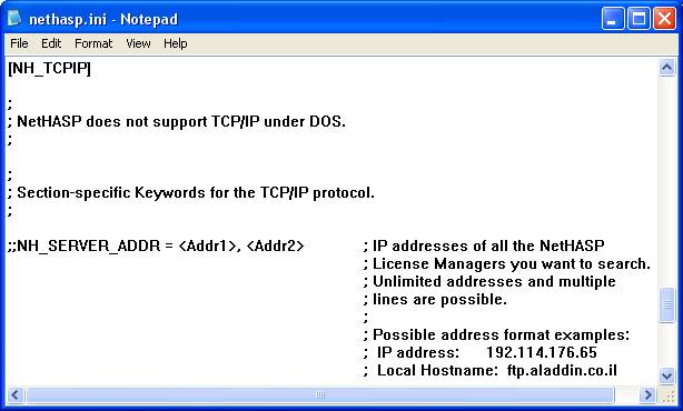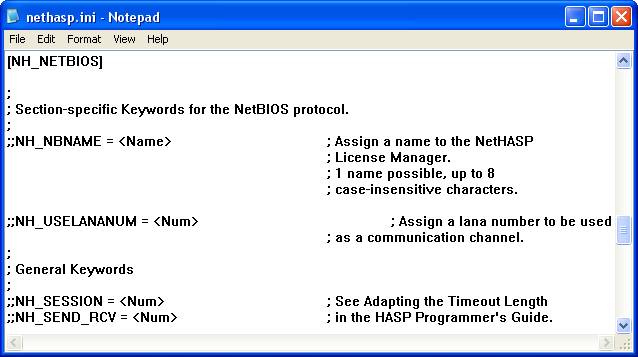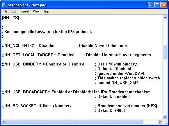При установке системы 1С:Предприятие 8.0 образец файла NETHASP.INI копируется в подкаталог BIN установочного каталога системы 1С:Предприятие 8.0. Данный файл полностью состоит из закомментированных строк и никак не переопределяет значений параметров по умолчанию, но при этом он содержит наиболее полный список параметров, которые могут использоваться для настройки взаимодействия системы 1С:Предприятие 8.0 с HASP License Manager.