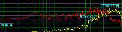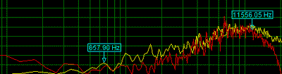 Для примера возьмём исходный луп этой партии из Fruity Loop (красный) и сравним его АЧХ с тем лупом, который прошёл частотную обработку в Sound Forge (жёлтый). Ясно видно, что необработанный луп звучит практически одинаково по всему диапазону частот, мало того после 11 kHz имеется явный спад, что крайне нежелательно сказывается на звуке. Обработанный луп тоже имеет спад, но он не так значителен. Значимая частотная составляющая лежит в диапазоне от 4 - 12 kHz то есть практически не затрагивает средние частоты. На слух такой hat будет восприниматься очень хорошо.