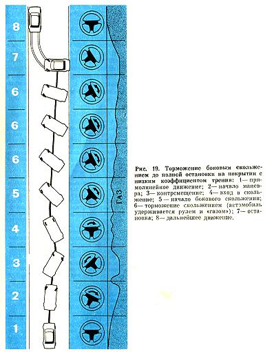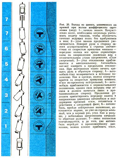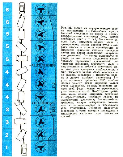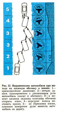 Действуя по известной методике, в момент касания обочины необходимо обеспечить пробуксовку задних колес в снегу - это уменьшит силу удара (см. рис, 22.3). Для этого не всегда достаточно просто открыть «газ», а требуется успей еще переключиться на низшую передачу Кроме того, после удара о рыхлую обочину и сильного разворота автомобиля не сбрасывая «газа», следует быстро поста вить колеса в положение «прямо». Инач< автомобиль тут же окажется в кювете