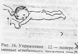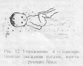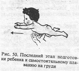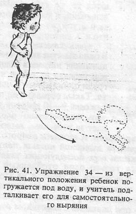 3 секунды, потом на 5-6 секунд, на 10-15 и т.д., доходя до нескольких минут. Помогает и такой прием: поддерживая малыша левой рукой под живот, учитель своей правой рукой быстро погружает его под воду (конечно, при условии, что ребенок уже был ранее хорошо обучен погружениям) до дна ванны и там дает ему полную свободу действий. В стремлении выбраться на поверхность ребенок может начать активные движения ногами или руками. Если он не проявит активности, учитель немедленно помогает ему своей левой рукой всплыть наверх. При выполнении этого приема учитель должен соблюдать все условия погружений (см. стр.78 и 81).