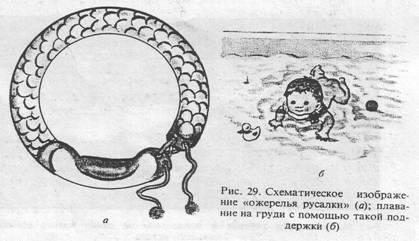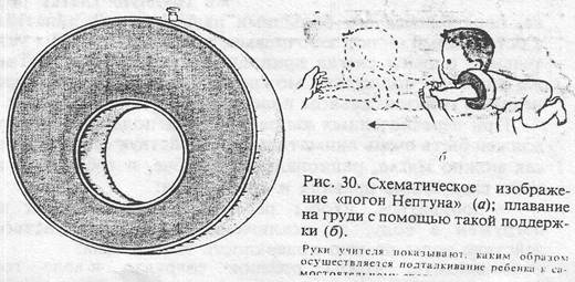 воздуха в ванной комнате); в изменении характера поддержки тела ребенка на поверхности воды, в переходе от активной поддержки (с помощью рук учителя) к пассивной (с помощью надувных резиновых изделий и других непотопля