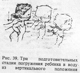 сидя на руке учителя) пли на седьмой (положение стоя с помощью рук учителя). В эти короткие промежутки времени на голову ребенка можно периодически поливать теплую воду, приучая его к задержке дыхания и стимулируя движения ногами. Вода поливается вначале из ладони учителя, потом из стакана, затем из губки и лейки, наконец