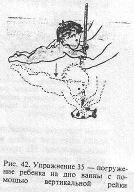 случаях, когда обычные упражнения (31-35) не дают успеха. Учитель находится в ванне и поддерживает ребенка способом «лицом к лицу». Перед глазами ребенка он погружает свою голову в воду (соскальзывая вниз и вытягивая вперед ноги), с шумом выдыхает в воду воздух, образуя пузырьки. Затем с улыбкой показывается над водой, приговаривая: «Хорошо! Делай так. Спрячь голову в воду». Если ребенок не хочет выполнять это, учитель принудительно погружает его лицо под воду. Упражнение повторяется 6-8 раз за урок.