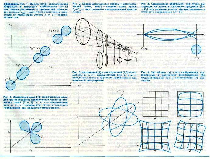 А. обусловлена разбросом начальных скоростей эл-нов в плоскости предмета (немонохроматичностью электронного пучка). Вследствие хроматич. А. в плоскости изображения вместо точки получается пятно (кружок хроматич. рассеяния), форма к-рого зависит от положения точки в плоскости предмета (её уда 13513f519n ления от оси; рис. 1). Хроматич. А. корректируются с помощью неосесимметричных (т. н. квадруполыных) линз, обладающих как рассеивающим, так и собирающим действием. Осевой астигматизм (А. 1-го порядка) связан с нарушением осевой симметрии электрич. и магн. полей. Вследствие осевого астигматизма для точки, находящейся на оси системы, на изображении получаются два взаимно перпендикулярных отрезка, расположенных в двух разных сечениях пучка (сагиттальном и меридиональном); изображения в др. сечениях имеют форму эллипса (рис. 2). Осевой астигматизм может быть исправлен дополнит, неосесимметричными линзами-стигматорами, действие к-рых обратно действию возмущающего поля в корректируемой линзе. В непараксиальных пучках геометрич.