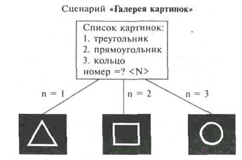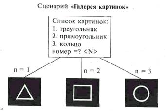 В соответствии с этими четырьмя картинками построим три вспомогательных алгоритма рисования отдельных картинок из «Галереи» и общий алгоритм выбора картинок в соответствии с приведенным выше сценарием: