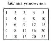 Запуск этой программы на ЭВМ приведет к получению приведенной выше картинки с таблицей умножения размера 5х5. Для получения таблицы умножения размера 8х8 или 10х10 достаточно изменить в программе значение n = 5 на n = 8 или n = 10.