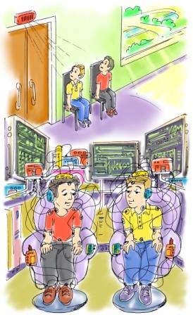 Пока он говорил, ребят усадили в кресла и начали обвешивать пучками электрических датчиков. По окончанию процедуры они стали похоже на больших любопытных ежей.