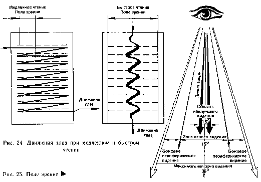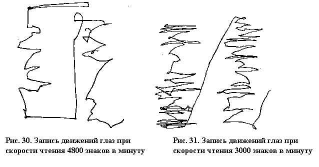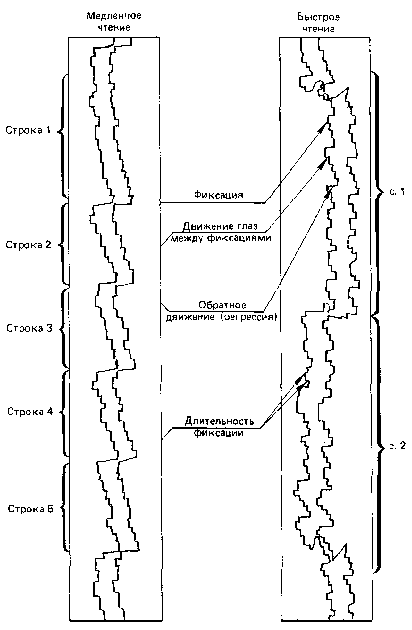2-5 раз в секунду. Причем, как показывают наблюдения, при чтении текста такие скачки совершаются вдоль строки 3-4 раза в секунду. На рис. 20 показан характер микродвижений глаз.