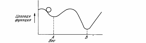 При критических температурах небольшое уменьшение температуры приводит к большому изменению средней величины целевой функции. Возвращаясь к аналогии с шариком, при «температуре», когда шарик обладает достаточной средней энергией, чтобы перейти из A в B B A A е. средней скорости изменения температуры с целевой функцией. При достижении критической температуры скорость изменения температуры должна замедляться, чтобы гарантировать сходимость к глобальному минимуму. При всех остальных температурах может без риска использоваться более высокая скорость снижения температуры, что приводит к значительному снижению времени обу 22122r175w 095;ения.